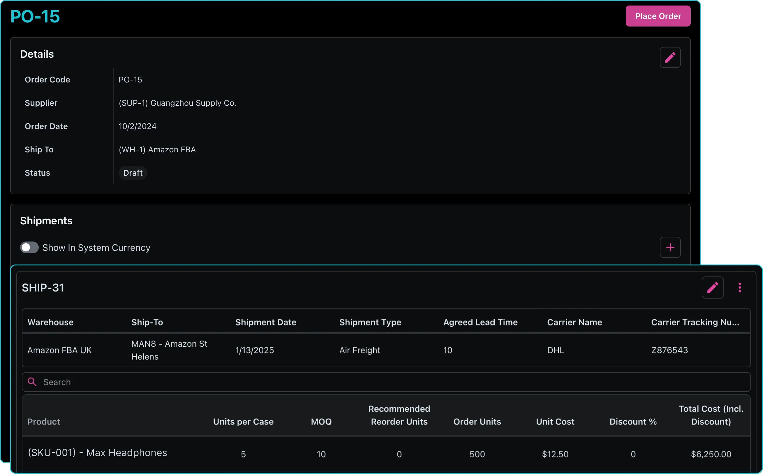 Get alert notifications for, and view the status of all shipments and Purchase Orders as statuses which are automatically updated and reported to you in real time.
